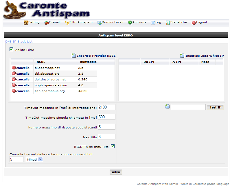 Providers who provide these services are many, we have surveyed 7, assessed with the scores and were included in the default configuration of Caronte Antispam.