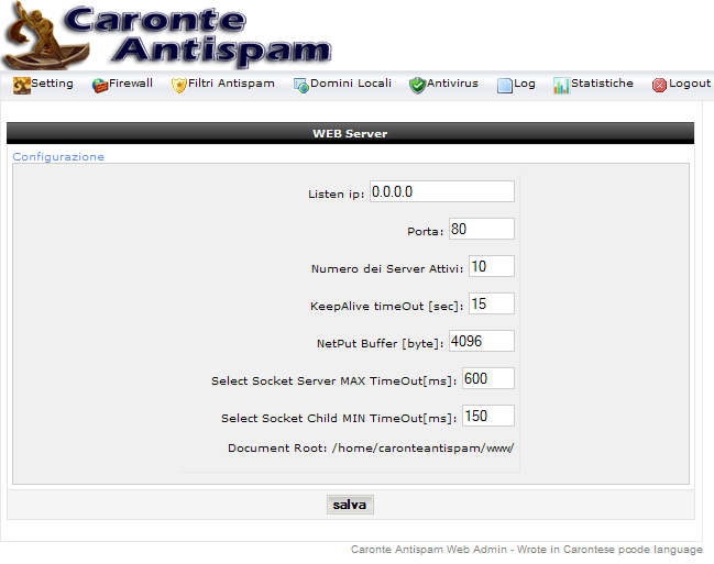 The WEB service of the GUI is integrated in Caronte Antispam in a light mode, however it is possible to raise up the performance customizing the configuration.